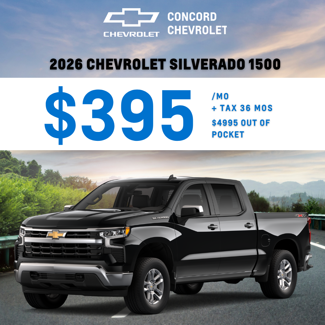 CONCORD CHEVROLET SPECIALS DISCLAIMER == Applies to New 2026 Chevrolet Silverado 1500 LT (VIN: 1GCRKKEK6TZ261351) 1 in stock at this Discount off MSRP. MSRP of $51,095 - $9,245 due at lease signing including $395 first monthly payment, $8,078.72 capitalized cost reduction, plus taxes, titles, license and documentary service fees. No security deposit required. Monthly payment Includes $2,500 Lease Loyalty Cash (If not, $2,500 has to be put down to match the advertised payment), $1,250 GM Warehouse, and $500 GM Rewards Card Sign Up. Option to purchase at lease end $34,233.65. Lessee is responsible for $.25 per mile over 10,000 miles year, excess wear, and a $395 termination fee. Offer Expires 5/01/2026.