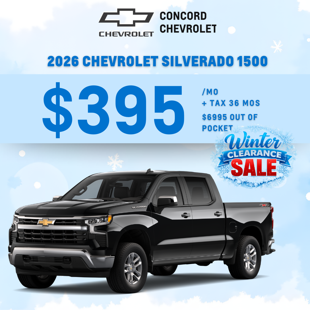 CONCORD CHEVROLET SPECIALS DISCLAIMER == Applies to New 2026 Chevrolet Silverado 1500 LT (Stock #: TZ261351) 1 in stock at this Discount off MSRP. MSRP of $51,095 - $7,995 due at lease signing including $395 first monthly payment, $7,705.00 capitalized cost reduction, plus taxes, titles, license and documentary service fees. No security deposit required. Monthly payment Includes $2,500 Lease Loyalty Cash (If not, $2,500 has to be put down to match the advertised payment), $1,250 GM Warehouse, $1,000 Lease Cash and $500 GM Rewards Card Sign Up. Option to purchase at lease end $31,678.90. Lessee is responsible for $.25 per mile over 10,000 miles year, excess wear, and a $395 termination fee. Offer Expires 4/02/2026.