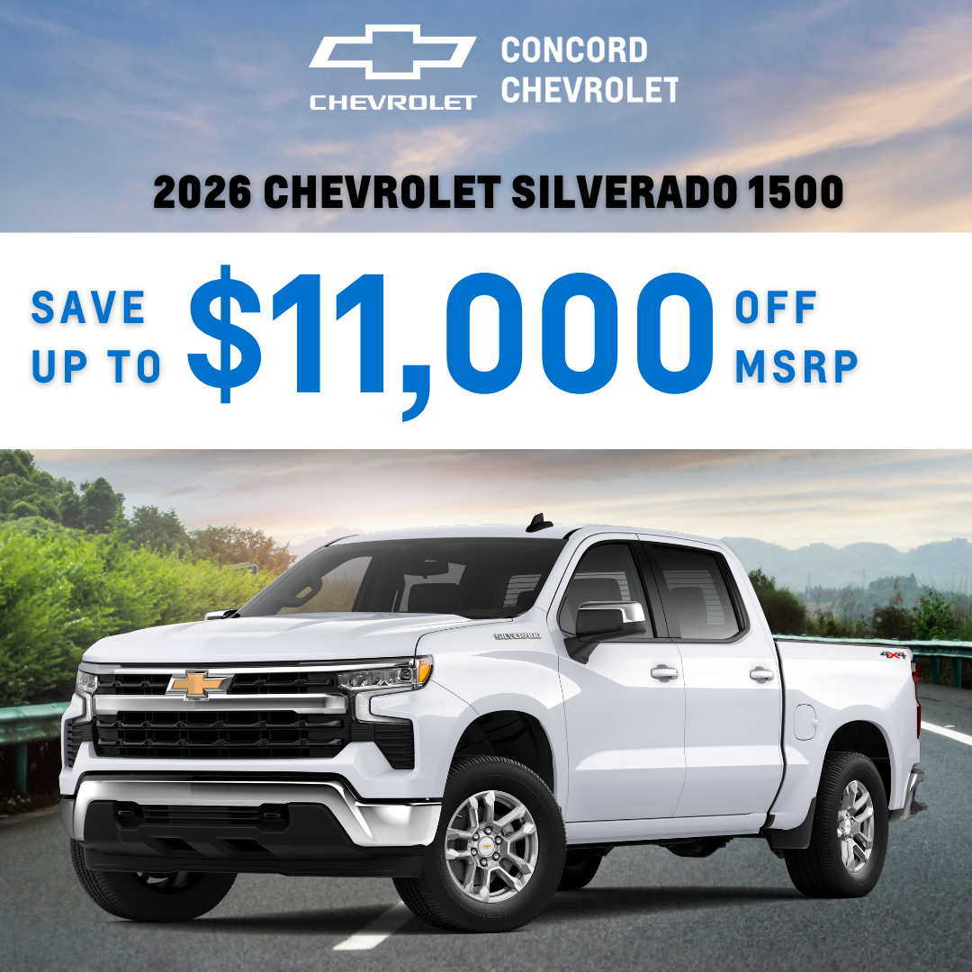 CONCORD CHEVROLET SPECIALS DISCLAIMER == Applies to New 2026 Chevrolet Silverado 1500 (Stock: TZ123795, TZ125989, TZ125979, TZ129651 and TZ136652) 5 in stock at this Discount off MSRP. MSRP $58,795 , Dealer Discount $6,250 (Includes Supplier Pricing) Chevrolet Customer Cash $2,000, $1000 Chevrolet Select Market Bonus, $1,250 GM Warehouse and $500 GM Rewards Card Sign Up. Prices do not include government fees and taxes, any finan)ce charge, any dealer document processing charge, any electronic filing charge and any emissions testing charge. Offer Offer Expires 5/01/2026.