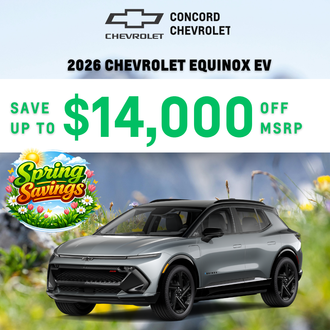 CONCORD CHEVROLET SPECIALS DISCLAIMER == Applies to New 2026 Chevrolet Equinox EV (STK# TS119289, TS105412, TS119251, TS119253, TS104853, TS104919 and TS104816) 7 in stock at this discount of MSRP. MSRP $50,490. Dealer Discount $4,250, Customer Cash $8,000, GM Conquest $1,250, GM Lease and $500 GM Rewards Card Sign Up. Prices do not include government fees and taxes, any finance charge, any dealer document processing charge, any electronic filing charge and any emissions testing charge. Offer Offer Expires 4/02/2026.