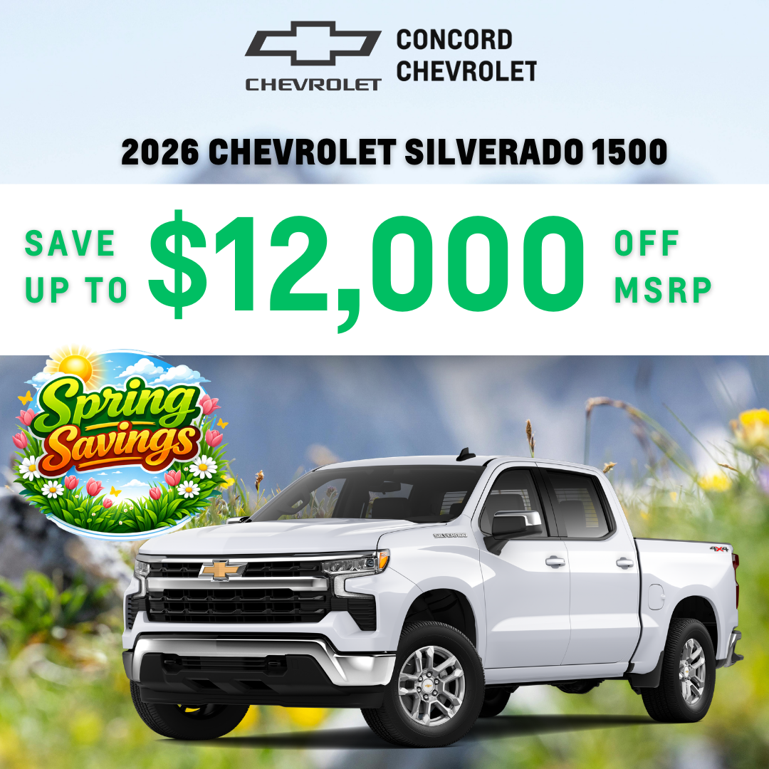 CONCORD CHEVROLET SPECIALS DISCLAIMER == Applies to New 2026 Chevrolet Silverado 1500 (Stock: TZ123795, TZ125989, TZ125979,TZ131401, TZ128733, TZ129651 and TZ136652) 7 in stock at this Discount off MSRP. MSRP $58,795 , Dealer Discount $5,250 Chevrolet Customer Cash $3,000, $1000 Chevrolet Select Market Bonus, and $1000 Bonus Select Cash, $1,250 GM Warehouse and $500 GM Rewards Card Sign Up. Prices do not include government fees and taxes, any finan)ce charge, any dealer document processing charge, any electronic filing charge and any emissions testing charge. Offer Offer Expires 4/02/2026.